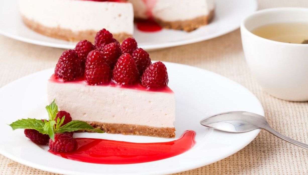 Backofen auf 200 Grad Celsius vorheizen. Eier trennen. Eigelbe mit 1 EL heißem Wasser, Zucker und Vanillezucker schaumig schlagen. Haferflocken, Mehl, Speisestärke sowie Backpulver mischen und unterheben. Eiweiß steif schlagen, darauf geben und vorsichtig unterrühren. Biskuitmasse in eine mit Backpapier ausgelegte Springform (Durchmesser 26 cm) streichen und 25 Minuten backen. Herausnehmen, Biskuit aus der Form lösen, Backpapier abziehen und auskühlen lassen. 500 g Himbeeren verlesen, Gelatine einweichen. Joghurt, Zucker und Vanillezucker verrühren. Gelatine ausdrücken, in einem Töpfchen bei geringer Wärme auflösen. Einige Esslöffel der Joghurtmasse zur Gelatine geben und verrühren. Dann die restliche Masse dazugeben, Quark und Himbeeren unterheben. Tortenring um den Biskuit schließen. Die Creme einfüllen, glatt streichen und circa drei Stunden kühl stellen. Übrige Beeren verlesen. Für den Guss 50 g Himbeeren pürieren, mit Saft und Tortenguss aufkochen. Etwas abkühlen lassen und auf der Torte verteilen. Die restlichen Beeren hineinsetzen. Guss fest werden lassen, den Ring entfernen. Eventuell mit einigen Pistazien verzieren.